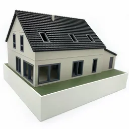 Das physische 3D Architekturmodell des modernen Einfamilienhauses ist im Maßstab 1:50 aus biologisch abbaubarem Kunststoff hergestellt. Als Grundlage dient ein 2D Grundriss.